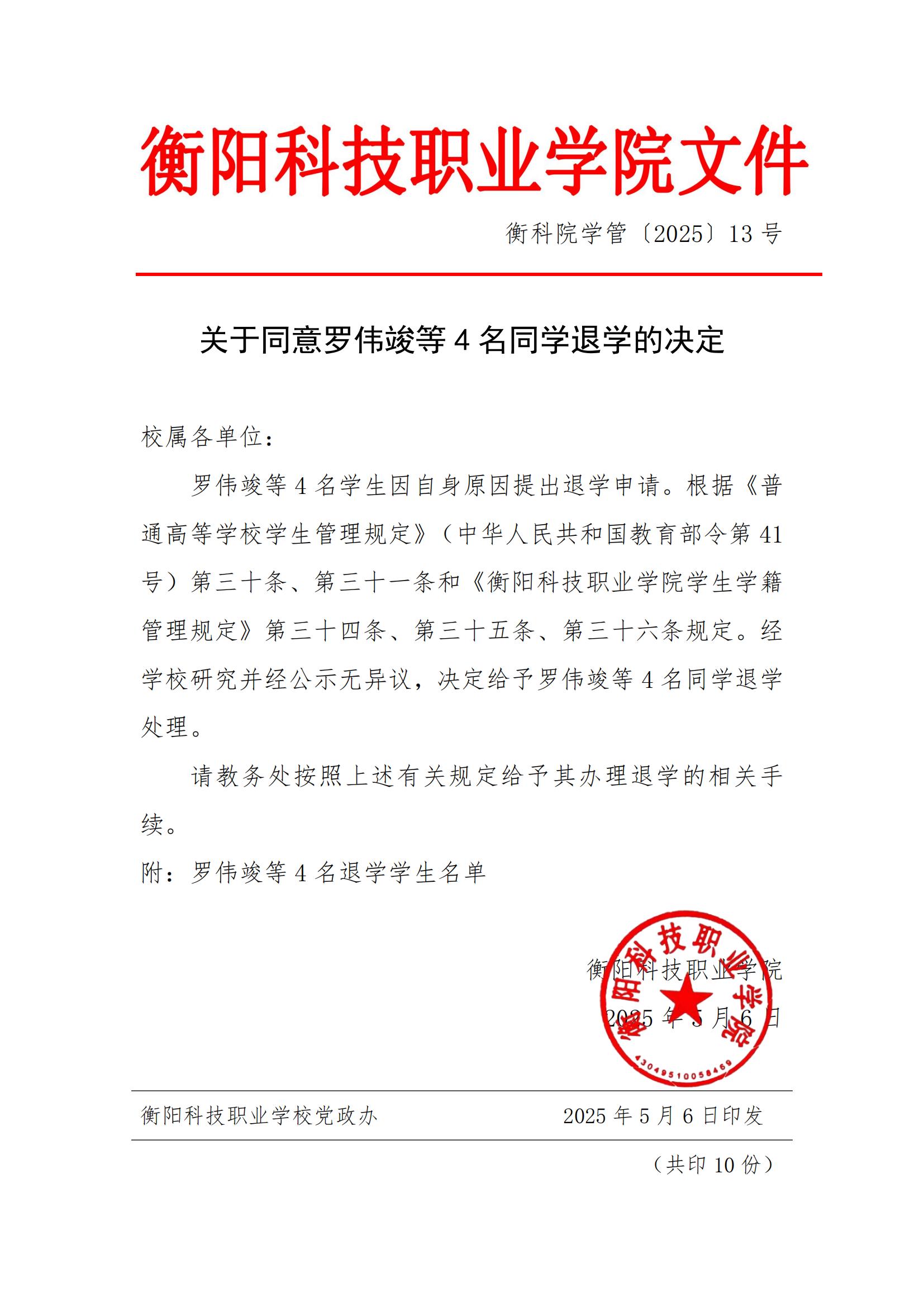 (衡科院学管〔2025〕13号)关于同意罗伟竣等4名同学退学的决定