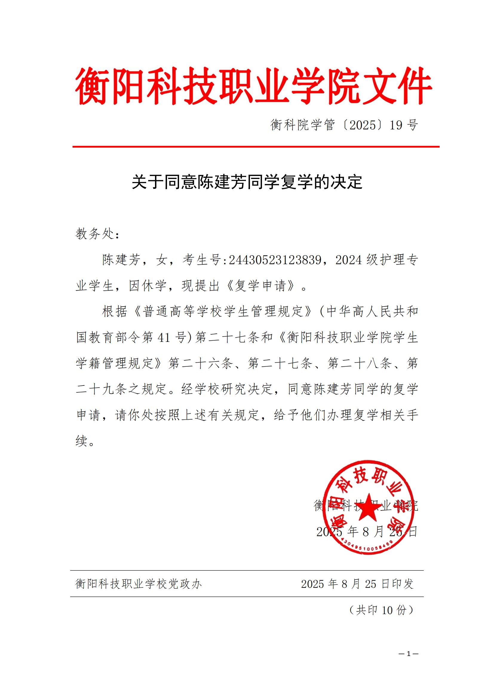 (衡科院学管〔2025〕19号)关于同意陈建芳同学复学的决定