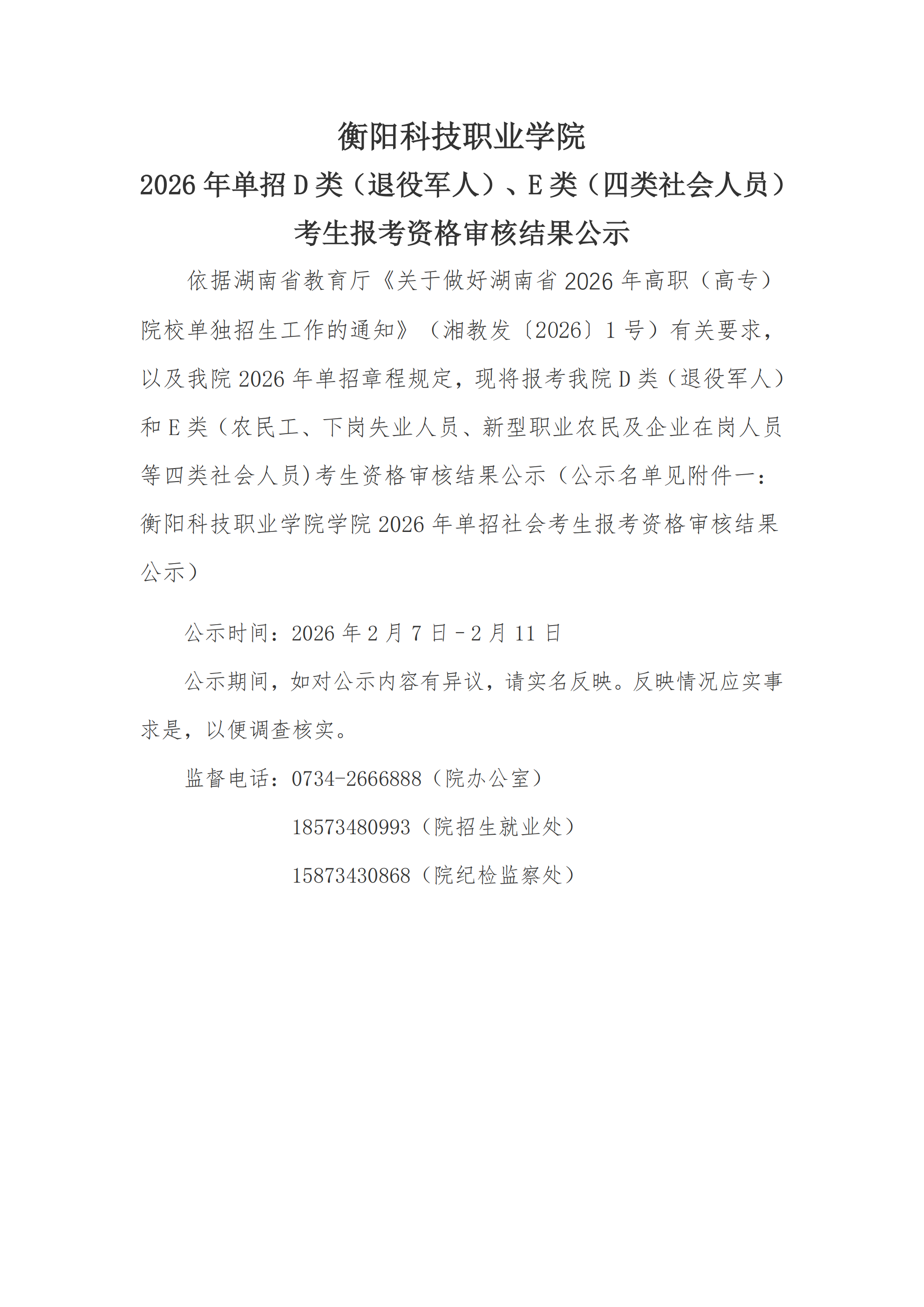 依据湖南省教育厅《关于做好湖南省2026年高职(高专)院校单独招生工作的通知》(湘教发〔2026〕1号)有关要求,以及我院2026年单招章程规定,现将报考我院D类(退役军人)和E类(农民工、下岗失业人员、新型职业农民及企业在岗人员等四类社会人员)考生资格审核结果公示(公示名单见附件一:衡阳科技职业学院2026年单招D类(退役军人)、E类(四类社会人员)考生报考…