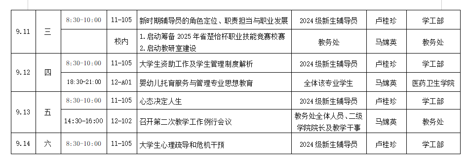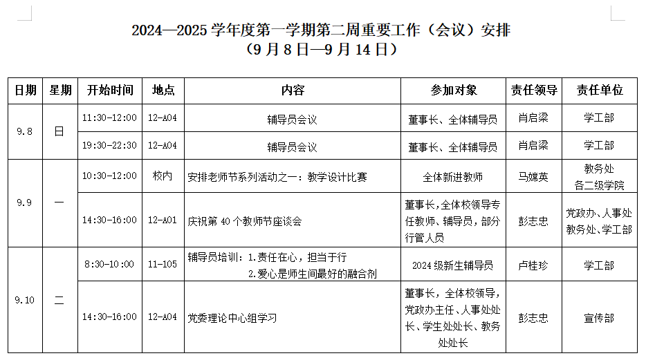 2024—2025学年度第一学期第二周重要工作(会议)安排(9月8日-9月14日)