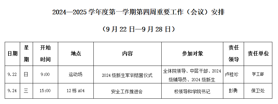 2024—2025学年度第一学期第四周重要工作(会议)安排(9月22日-9月28日)