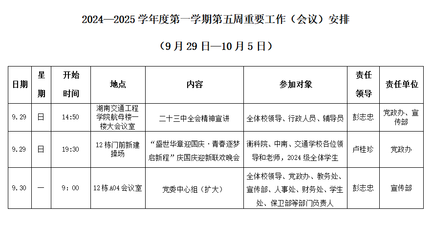 2024—2025学年度第一学期第五周重要工作(会议)安排(9月29日-10月5日)