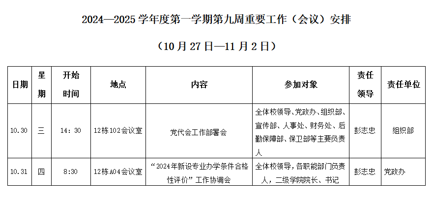 2024—2025学年度第一学期第九周重要工作(会议)安排(10月27日-11月2日)