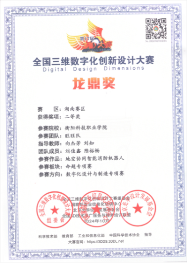 2024年11月2日,第17届全国三维数字化创新设计大赛(简称“全国3D大赛”)省部赛区颁奖典礼圆满落幕。衡阳科技职业学院师生团队凭借作品《地空协同智能消防机器人》斩获二等奖,展现了职业院校在数字化设计与智能消防领域的创新实力。