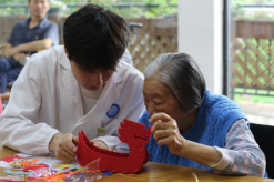 食堂里,师生们与老人围坐一起包粽子、擀饺子皮,巧手翻飞间,一个个饱满的粽子和饺子整齐排列。76岁的李奶奶捧着刚出锅的粽子,笑得合不拢嘴:“孩子们手艺真好,这粽子有家的味道!”活动室里,志愿者们还带领老人制作手工香囊和“拼龙舟”贴画,欢声笑语不断。