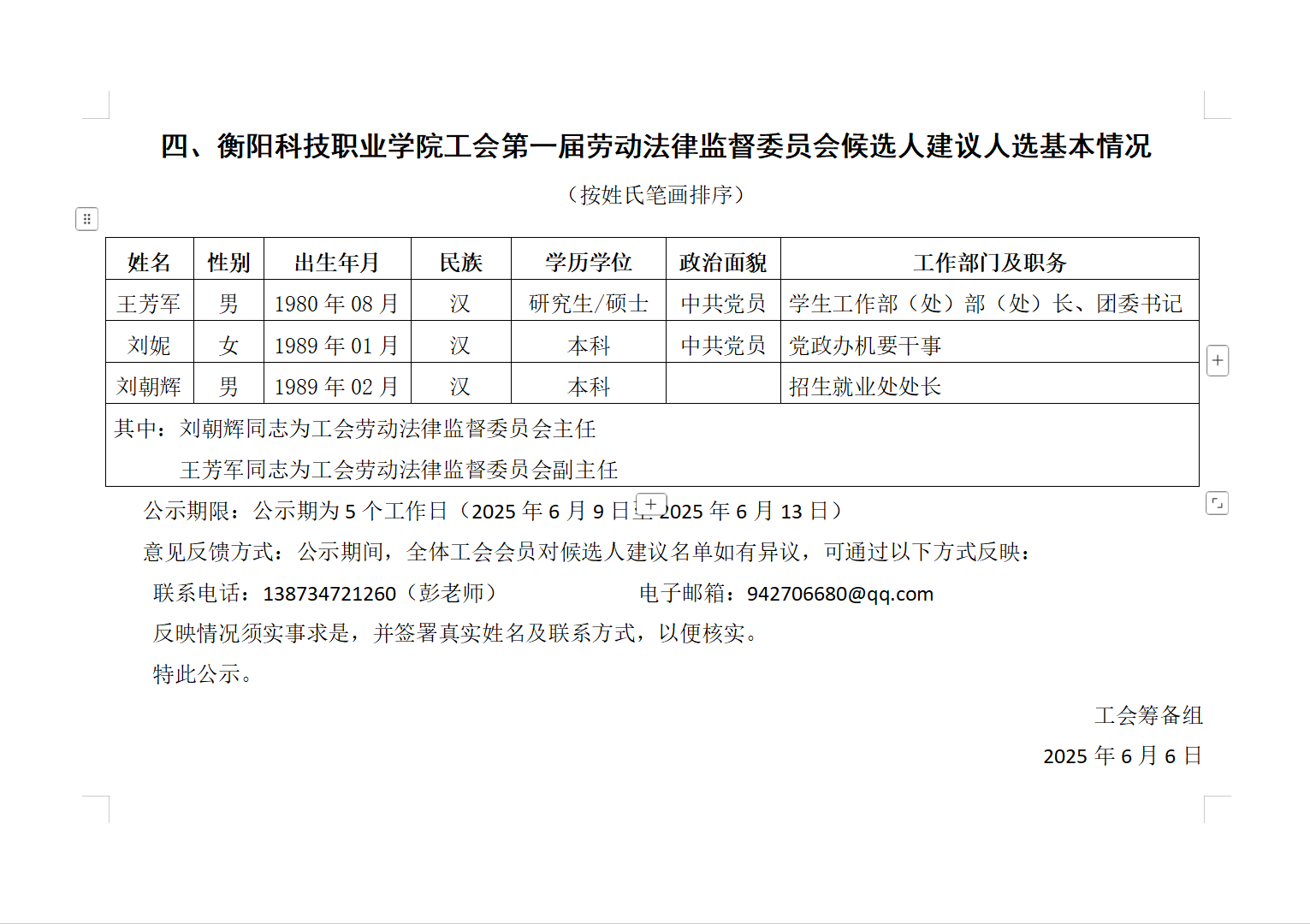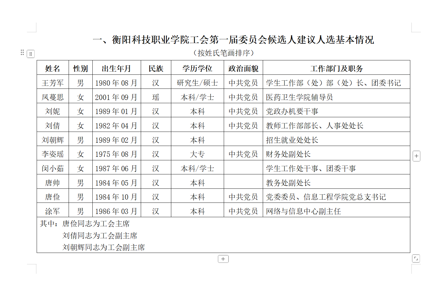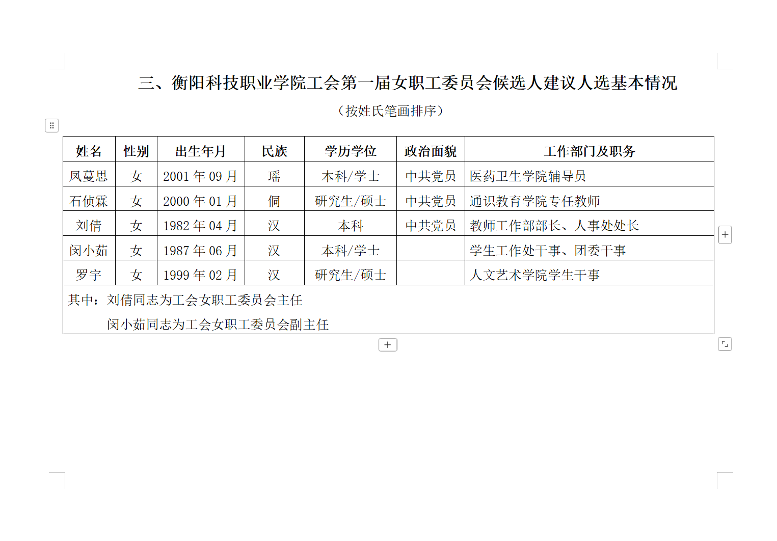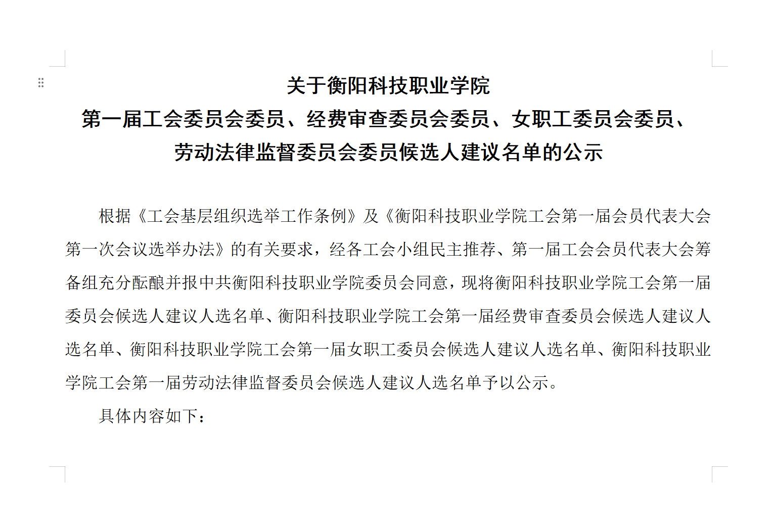 关于衡阳科技职业学院第一届工会委员会委员、经费审查委员会委员、女职工委员会委员、劳动法律监督委员会委员候选人建议名单的公示