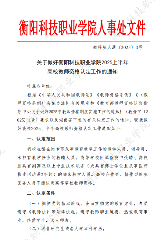 衡科院人通〔2025〕03号关于做好衡阳科技职业学院2025上半年教师资格认定工作的通知