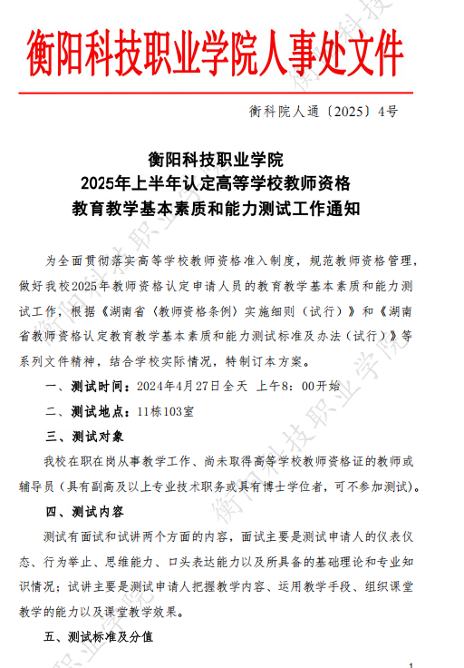 衡科院人通〔2025〕04号衡阳科技职业学院2025 年上半年认定高等学校教师资格教育教学基本素质和能力测试工作通知