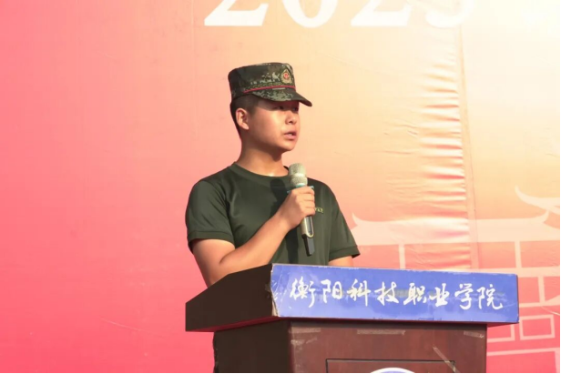 来自交通运输学院的新生代表王蝶,上台分享了自己对军训的期待与感悟。她说:“军训不仅是对体能的考验,更是一堂关于团结的课程。在这里,我们不再是孤立的个体,而是荣辱与共的战友。”王蝶表示,希望通过军训这门特殊的“课程”,学会在训练中相互鼓励、在困难时彼此支持,真正懂得团结协作的意义。教官李磊代表教官团队作出郑重承诺。他表示,全体教官将严格遵循 “高标准、严要求、重安全”的原则,科学制定训练计划,耐心开展教学指导,确保每一位新生都能在训练中有所收获。