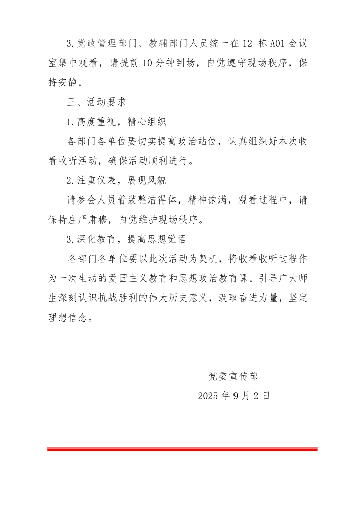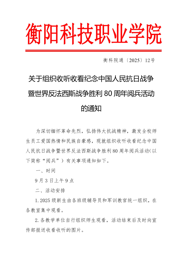 关于组织收听收看纪念中国人民抗日战争暨世界反法西斯战争胜利80周年阅兵活动的通知