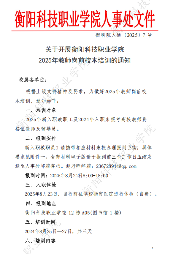 衡科院人通〔2025〕07号关于开展衡阳科技职业学院2025年教师岗前校本培训的通知