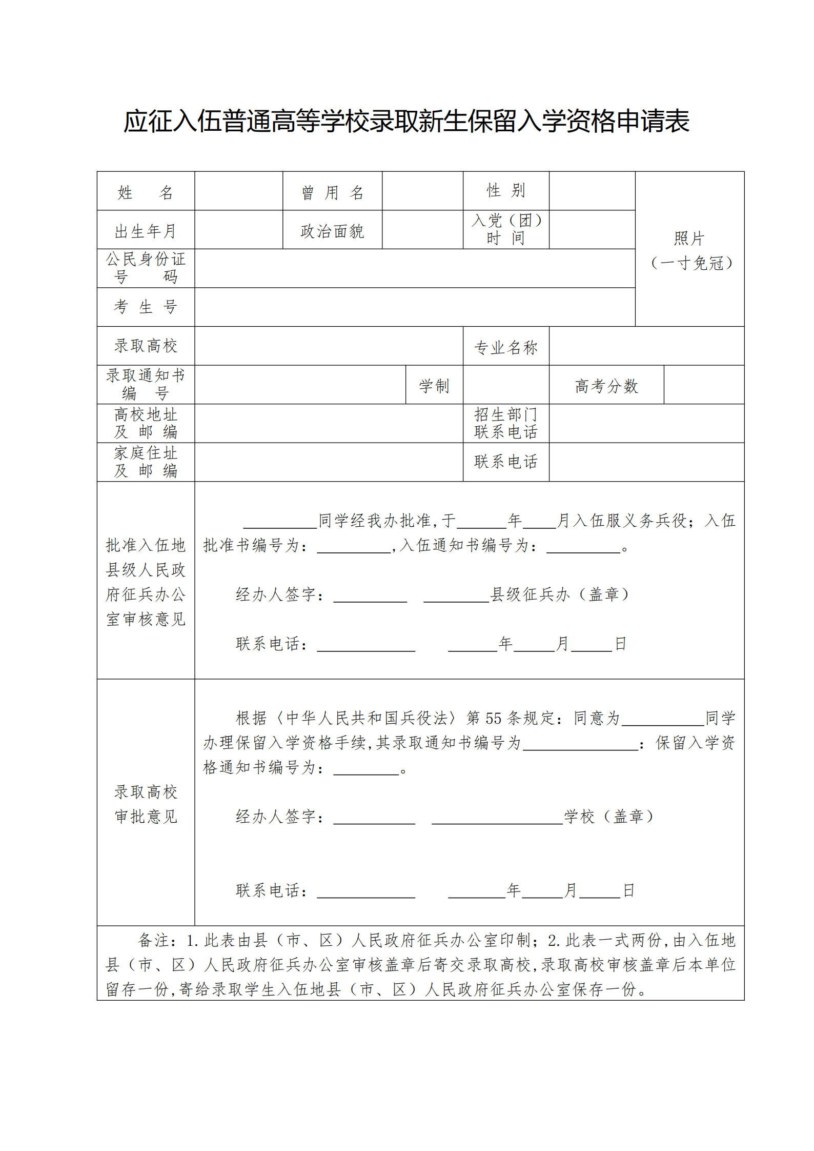 应征入伍普通高等学校录取新生保留入学资格申请表