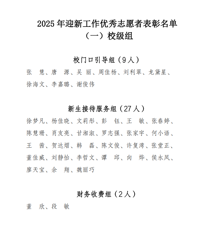 在 2025 年迎新工作中,学生志愿者为 2025 级新生提供了“安全、顺畅、温馨、周到”的迎新服务,协助完成各项新生接待工作,每人累计服务时长超 33 小时,赢得了新生和家长的高度赞赏,展示了衡阳科技职业学院学子良好的素养和形象。为表彰先进、弘扬正气、传播正能量,充分发挥青年典型示范引领作用,激发广大青年学子的责任感和使命感,决定授予张慧等 80 名同学迎新工作“优秀志愿者”荣誉称号。 希望受到表彰的同学珍惜荣誉、再接再厉,继续发挥模范带头作用,同时,号召全体同学以他们为榜样,积极参与志愿服务,践行志愿精神,为校园建设贡献力量。 如对拟推对象有异议,请于 2025 年 9 月 12 日 17:00 前向校团委反映,联系人:闵老师,联系地址:11 栋 101 室,逾期不受理。
