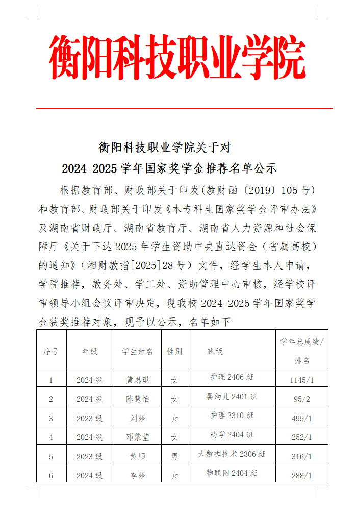 衡阳科技职业学院关于对 2024-2025学年国家奖学金推荐名单公示