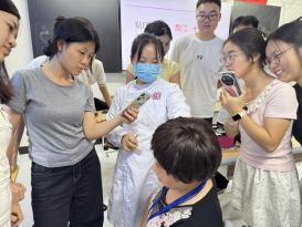 理论赋能,实践引领。讲座的高潮部分是互动实操环节。杨丽平、刘英、李丽平3位专家亲自指导师生们在模型和彼此身上进行定位、消毒、分组贴压豆粒的实践操作。“这里对应的是‘神门’,有安神助眠的效果;这里是‘胃区’,可以调理脾胃……”专家们手把手地教学,同学们聚精会神地聆听、模仿,现场学习气氛异常热烈。一颗颗细小的王不留行籽豆粒,在专家们的手中仿佛被赋予了神奇的魔力,激发了老师们极大的学习兴趣。