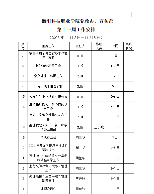 衡阳科技职业学院党政办、宣传部 第十一周工作安排(11月2日-11月8日)