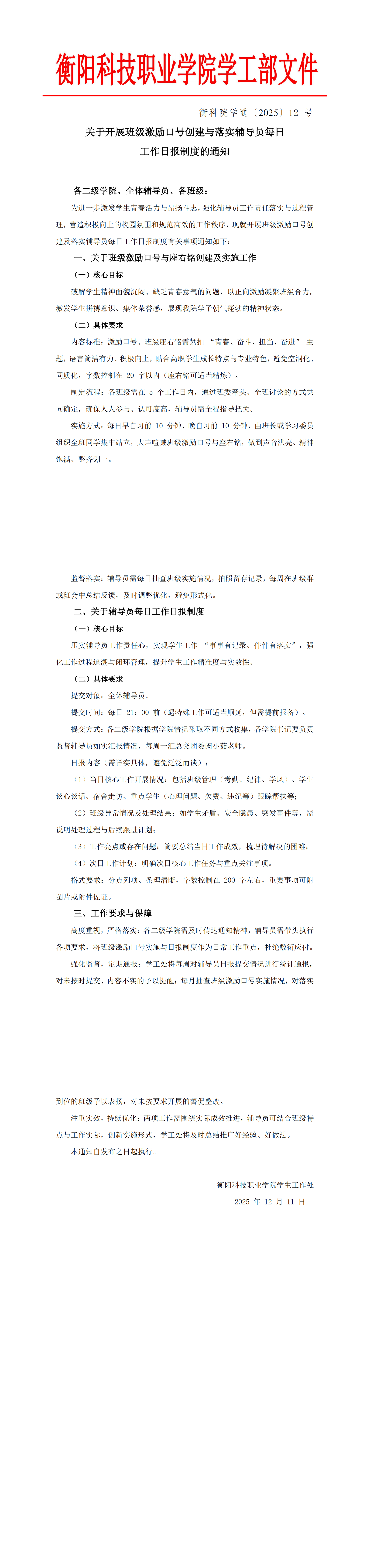 衡科院学通〔2025〕12 号 关于衡阳科技职业学院关于开展班级激励口号创建与落实辅导员日报通知