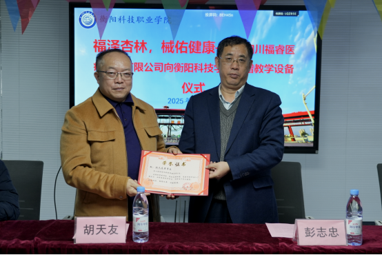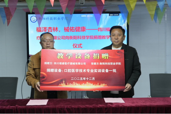 2025年12月16日下午17时,“福泽杏林,械佑健康——四川福睿医疗器械有限公司向衡阳科技职业学院捐赠教学设备仪式”在学校12-A01实训室隆重举行。仪式由副校长马嫦英主持,现场温情洋溢,庄重而热烈。