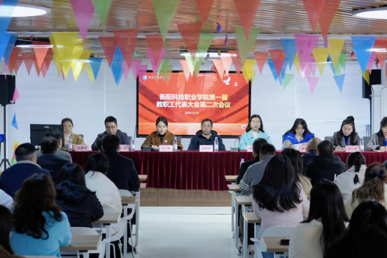 为完善学校治理体系、强化民主管理,凝聚全校教职工奋进力量,12 月 30 日下午 14:30,衡阳科技职业学院第一届教职工代表大会第二次会议在 12 栋 A01 会议室隆重召开。特邀代表、列席代表、全体教职工代表等出席会议。会议由学校工会副主席刘倩主持。