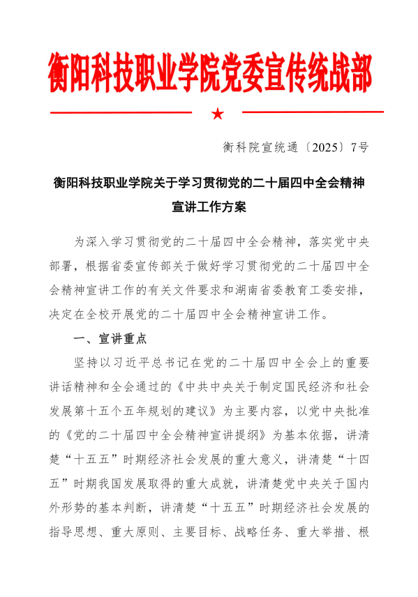 衡阳科技职业学院关于学习贯彻党的二十届四中全会精神宣讲工作方案