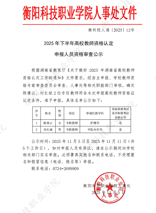 衡科人通 【2025】12号 2025年下半年高校教师资格认定申报人员资格审查公示