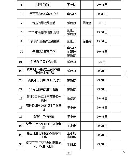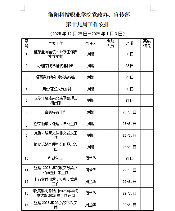 衡阳科技职业学院党政办、宣传部 第十九周工作安排(2025年12月28-2026年1月3日)